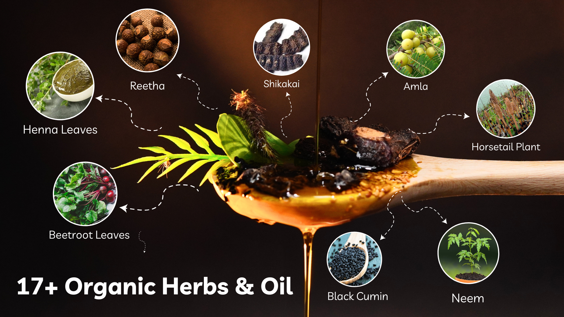Ingredients: Henna Leaves, Beetroot Leaves, Black Cumin, Amla, Reetha, Shikakai, HorseTail, Neem, Kalonji & 9+ more herbs.